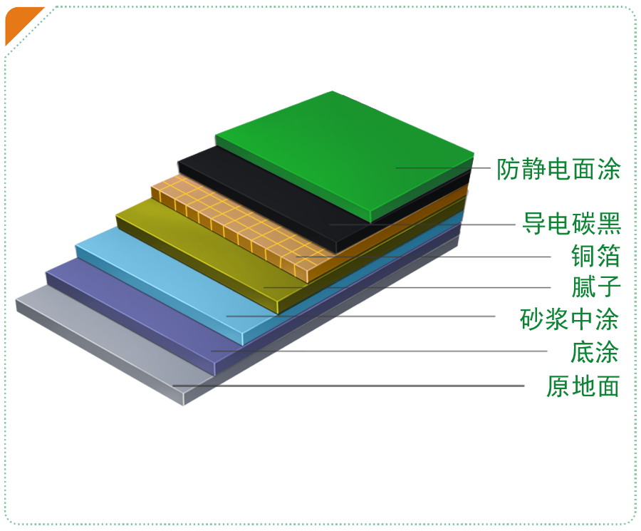 防靜電地坪是整個防靜電工作區接地系統的關鍵,它有效消除和防止靜電或電磁波產生,避免靜電火花及電磁波干擾及破壞,整體導電電阻在105-109Ω之間,結合其平整無縫、耐磨、耐壓、耐酸堿、耐化學藥品等優異性能,為工作者提供一個安全、舒適的空間。